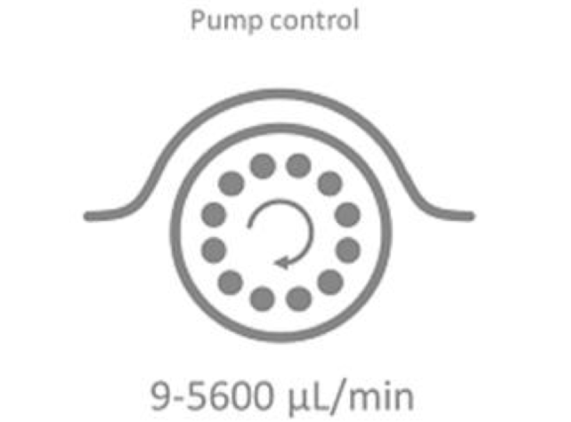 qCell T device comes with softrware integrated pump control. The 12 roller configuration of the peristaltic pump makes for minimal pressure fluctuations, providing a stable QCM-D signal. Flow rates are adjustable between 9-5600 μL and can be pre-programmed in software script function.