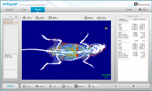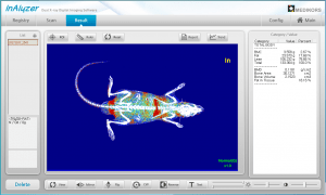 The advanced software overlays the area calculated for bone, lean tissue, and fat tissue on a single image for the entire animal.