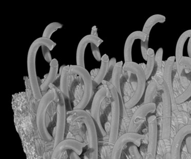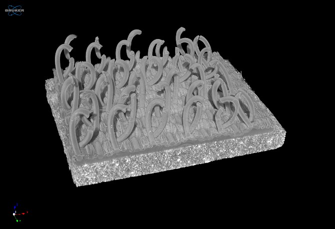 The structures that makes a burr so useful are its fine, hook-shaped spikes (See Figure 2). With this high resolution scan at 6.3 microns we can easily see the curved spikes and how well they grasp the dog hair. Comparing this close-up image of the burr to the Velcro sample (Figure 3), you can see the resemblance to the design.