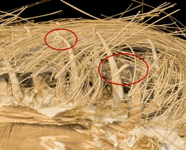 Even with the shape being similar there are other aspects of the burr that Mr. Mestral may not have looked at, such as the internal structure of the spike. Using a virtual cut with the CTVox software we were able to see that the spikes are actually hollow (Figure 4). Could this be an improvement to future designs of Velcro? If so, it may provide reduced material cost or possibly strength benefits due to being a hollow rod. Obviously, more research would need to be done but we will leave that to the experts in Velcro.