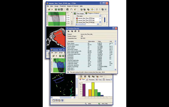 SkyScan’s volumetric NRecon reconstruction software is used to reconstruct cross-section slices from acquired Micro-CT angular projections through the object. The program uses a modified Feldkamp algorithm with automatic adaptation to the scan geometry in each micro-CT scanner. Reconstructed slices can be saved in BMP, TIFF, JPG or numerical data format. Reconstruction includes beam-hardening correction, alignment optimization, ring artifact correction, reconstruction in a restricted volume of interest, reconstruction of objects wider than the field of view, external and internal calibration into Hounsfield units and interactive density window selection.