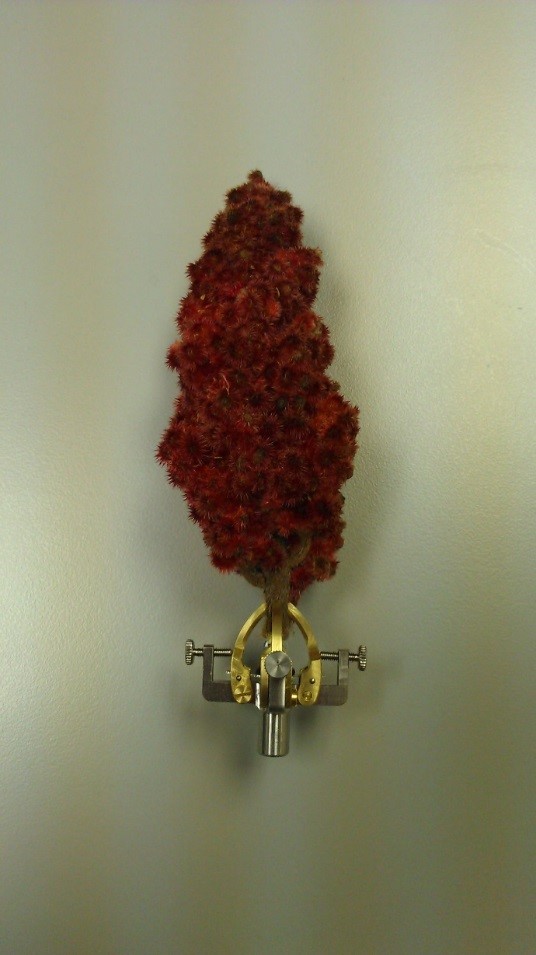 Using the claw mount, an optional holder for the Skyscan Micro-CT systems (see related tip of the month: October 2013), the Staghorn Sumac was fixed in a vertical position that enabled complete and clear images of just the sample. After scanning the staghorn sumac fruit, the images reveal the complexity of the internal structure. Looking at the 2-D cross sectional images of the fruit in DataViewer, one discovers the intricate array of seeds and the matrix of stems that support them (Figure 2).