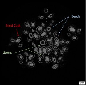 As an application, the 2D images can be useful to analyze the germination characteristics of staghorn sumac seeds. One aspect that affects germination is the amount of moisture entering the seeds. Studies have shown that the passage of staghorn sumac seed through the digestive system of rabbits, ring-necked pheasants, and quail increase germination1. The reason for this is due to acid break down that weakens the seed coat, allowing moisture to enter and start the germination process. Micro-CT image would be a useful tool for studying seed coat variation before and after digestion.