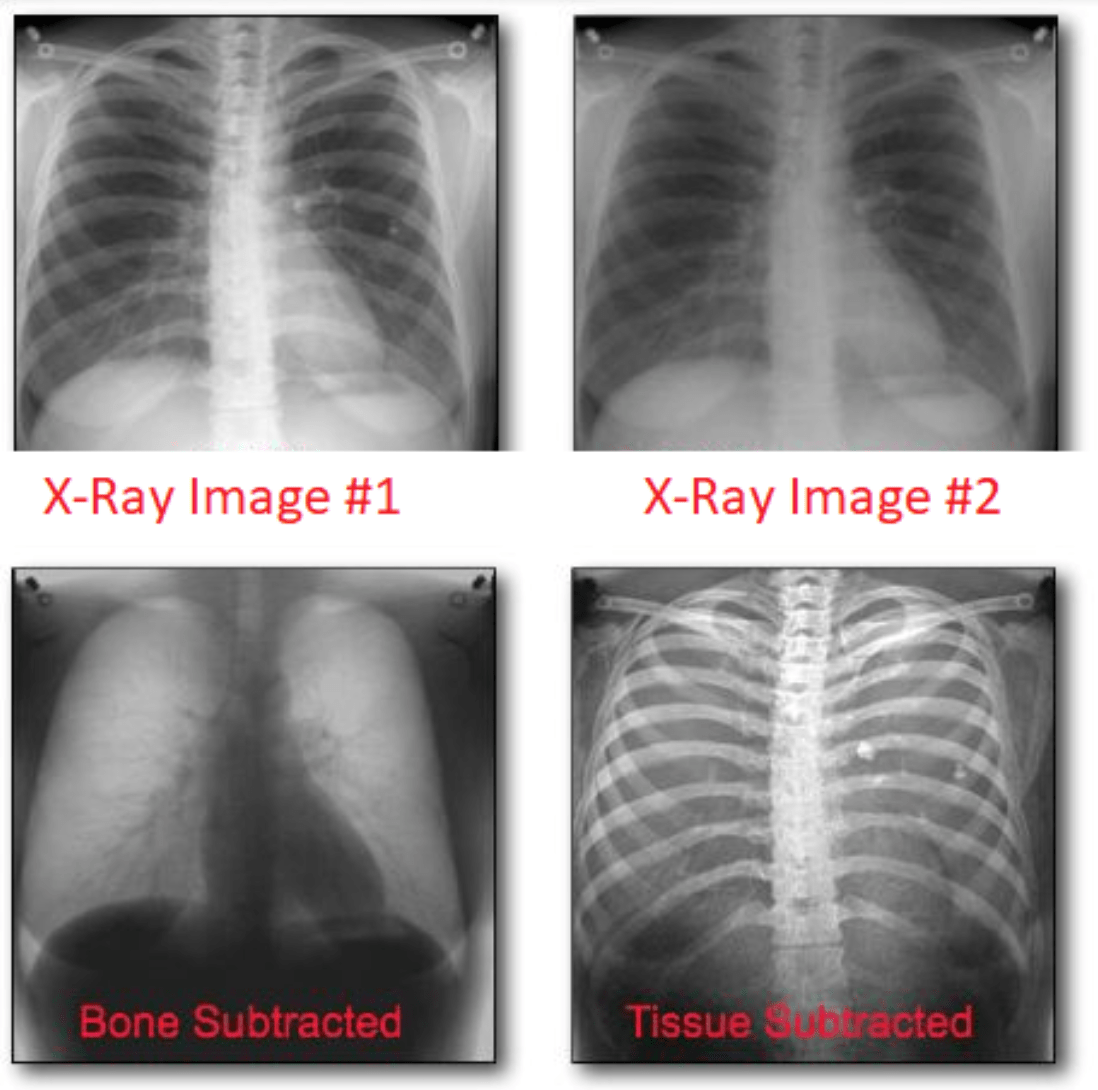 DEXA (DXA) or Dual Energy X-Ray Absorptiometry is a non-invasive imaging modality based on exploiting the difference in the X-Ray attenuation of tissue and bone at different X- ray energies. Calcified tissues such as bone absorb X-Rays a lot more than soft or low density tissues such as lean tissue, fat, and organs (Figure 1). Using mathematical algorithms based on extracting the amount of X-Rays that were absorbed by either tissue, bone information OR tissue information can be eliminated in the resulting radiograph (Figure 2).